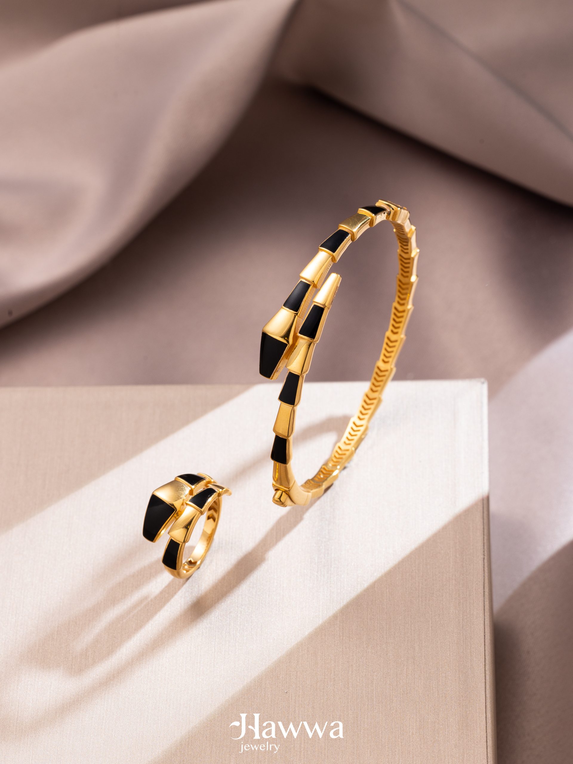 A luxurious gold bracelet and ring set inspired by Bulgari design, featuring striking black accents that create a bold and elegant contrast. The refined gold finish paired with the deep black details reflects modern sophistication and timeless luxury. With its iconic, well-balanced design, this set adds a powerful statement of elegance and is perfect for special occasions or elevated everyday wear.