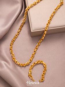 This luxurious gold set features interlocking rings, masterfully designed to create a sense of fluidity and sophistication. The long necklace drapes gracefully, highlighting the intricate pattern of the rings, while the matching bracelet mirrors the design for a coordinated, refined look. Polished to a brilliant shine, the set exudes timeless elegance, making it perfect for both everyday wear and special occasions. A harmonious blend of modern style and classic craftsmanship, this set is a standout addition to any jewelry collection.