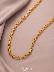 A long Turkish-style necklace featuring interlocking ring-shaped links, crafted with delicate detailing that reflects traditional Turkish artistry. Its sleek, elongated design makes it perfect for layering or wearing as a standout statement piece.