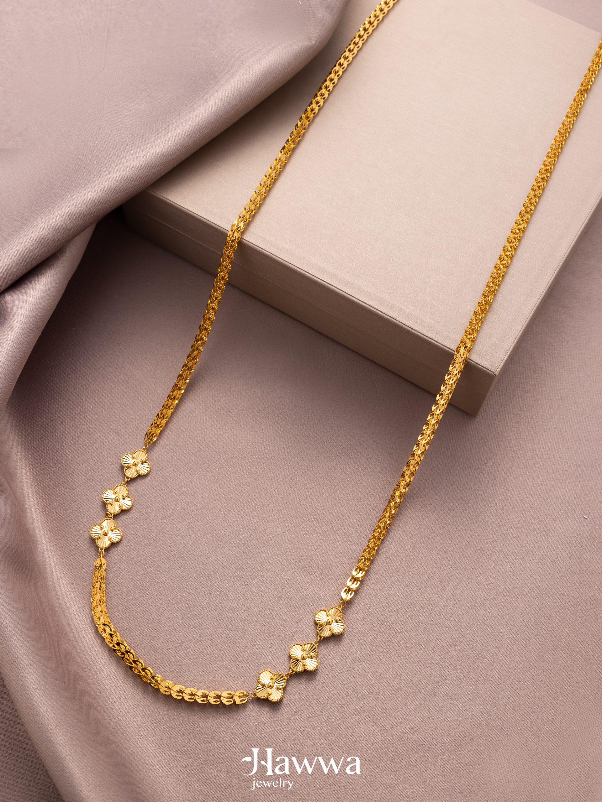 This refined long necklace is inspired by Van Cleef’s iconic aesthetic, featuring delicately crafted motifs that exude sophistication and charm. Its extended length allows it to drape beautifully, creating a graceful, elongated silhouette that enhances any outfit. Each motif is polished to a soft, luxurious shine, adding a touch of classic elegance with every movement. Perfect for layering or wearing as a statement piece, this necklace brings an air of timeless beauty and effortless chic to any jewelry collection.