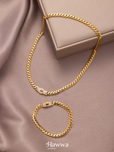 A Monaco chain jewelry set featuring a bold and elegant design with smoothly interlinked chains. The polished finish highlights its refined craftsmanship, creating a perfect balance between strength and sophistication. With its timeless style and luxurious appeal, this set is ideal for both everyday wear and special occasions.